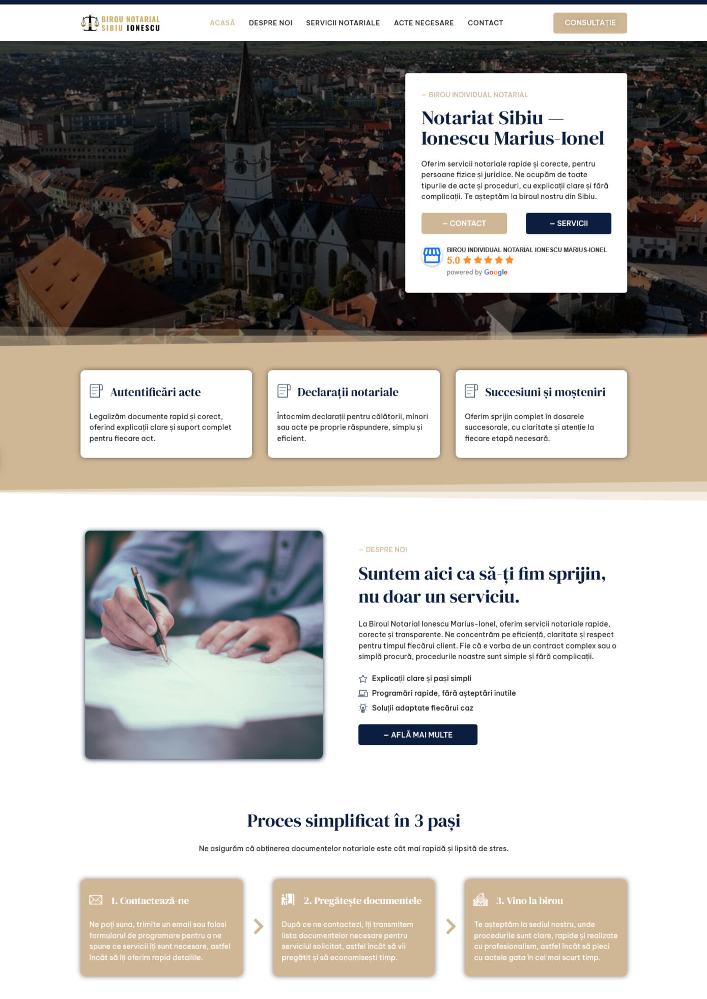 Un site de prezentare profesional pentru un birou notarial, dezvoltat în WordPress cu Elementor și design custom. Proiectul a inclus pagini dedicate serviciilor, informațiilor de contact și structurii organizaționale, fiind optimizat pentru viteză și responsivitate și livrat integral în 10 zile.